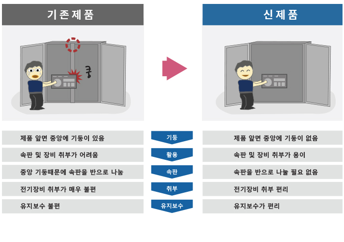 가운데 기둥이 없는 양개도어 전기외함 PS-IP-O 제품은 특수 절곡 구조로 특허
