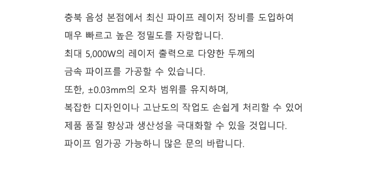 ![]() ![]() 충북 음성 본점에서 최신 파이프 레이저 장비를 도입하여 매우 빠르고 높은 정밀도를 자랑합니다. 최대 5,000W의 레이저 출력으로 다양한 두께의 금속 파이프를 가공할 수 있습니다. 또한, ±0.03mm의 오차 범위를 유지하며, 복잡한 디자인이나 고난도의 작업도 손쉽게 처리할 수 있어 제품 품질 향상과 생산성을 극대화할 수 있을 것입니다. 파이프 임가공 가능하니 많은 문의 바랍니다. |