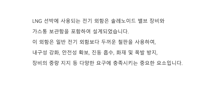 ![]() ![]() LNG 선박에 사용되는 전기 외함은 솔레노이드 밸브 장비와 가스통 보관함을 포함하여 설계되었습니다. 이 외함은 일반 전기 외함보다 두꺼운 철판을 사용하여, 내구성 강화, 안전성 확보, 진동 흡수, 화재 및 폭발 방지, 장비의 중량 지지 등 다양한 요구에 충족시키는 중요한 요소입니다. |