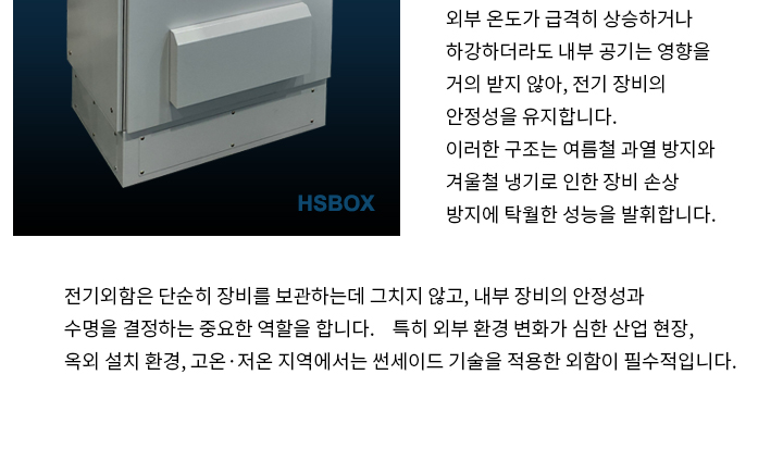 ![]() ![]() 급격한 온도 변화로 인해 전기외함 내부의 장비가 손상될 위험은 항상 존재합니다. 하지만 이제 걱정할 필요가 없습니다. 썬세이드를 적용한 전기외함은 이러한 문제를 해결하기 위해 설계된 최적의 솔루션입니다. 모든 면에 커버가 적용된 이 전기외함은 외부 환경의 영향을 최소화하면서도 내부를 완벽히 보호합니다. |