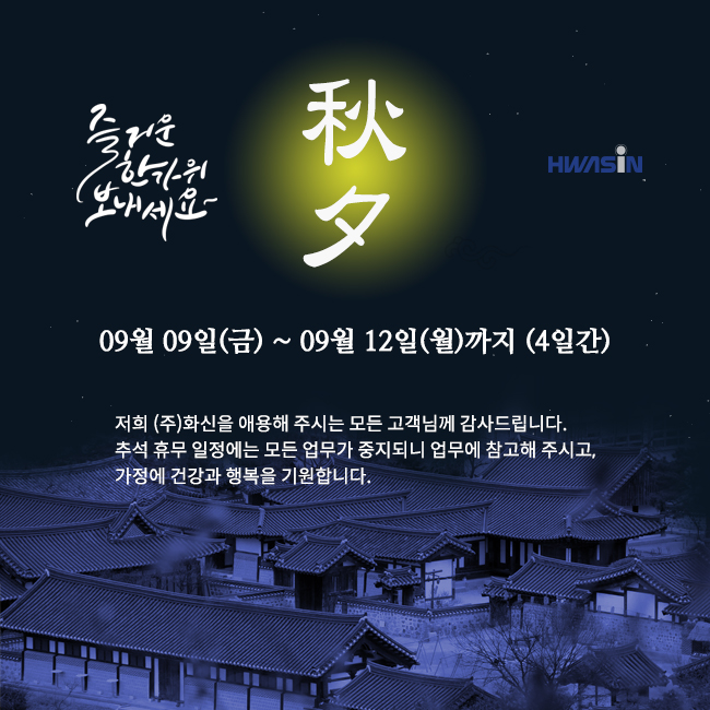 저희 (주)화신을 애용해 주시는 모든 고객님께 감사드립니다.추석 휴무 일정에는 모든 업무가 중지되니 업무에 참고해 주시고,가정에 건강과 행복을 기원합니다.