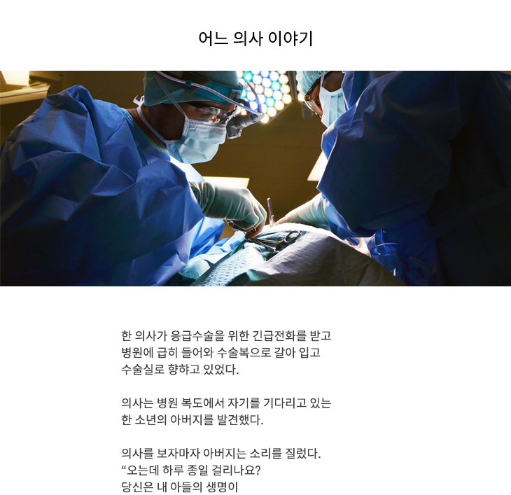 한 의사가 응급수술을 위한 긴급전화를 받고 병원에 급히 들어와 수술복으로 갈아 입고 수술실로 향햐고 있었다. 의사는 병원 복도에서 자기를 기다리고 있는 한 소년의 아버지를 발견했다. 의사를 보자마자 아버지는 소리를 질렀다. “오는데 하루 종일 걸리나요? 당신은 내 아들의 생명이 얼마나 위급한..