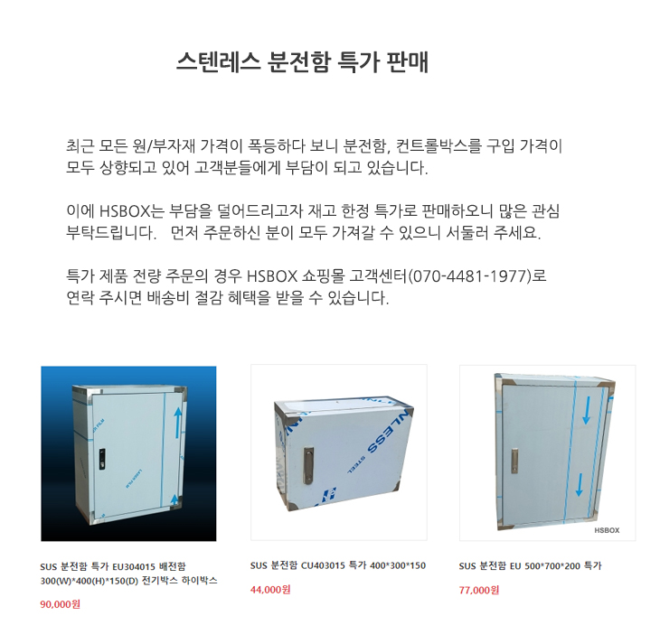 최근 모든 원/부자재 가격이 폭등하다 보니 분전함, 컨트롤박스를 구입 가격이 모두 상향되고 있어 고객분들에게 부담이 되고 있습니다. 이에 HSBOX는 부담을 덜어드리고자 재고 한정 특가로 판매하오니 많은 관심 부탁드립니다. 먼저 주문하신 분이 모두 가져갈 수 있으니 서둘러 주세요. 특가 제품 전량 주문..