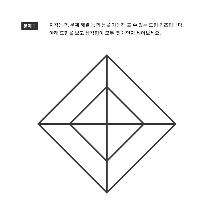 지각능력, 문제 해결 능력 등을 가늠해 볼 수 있는 도형 퀴즈입니다. 아래 도형을 보고 삼각형이 모두 몇 개인지 세어보세요.