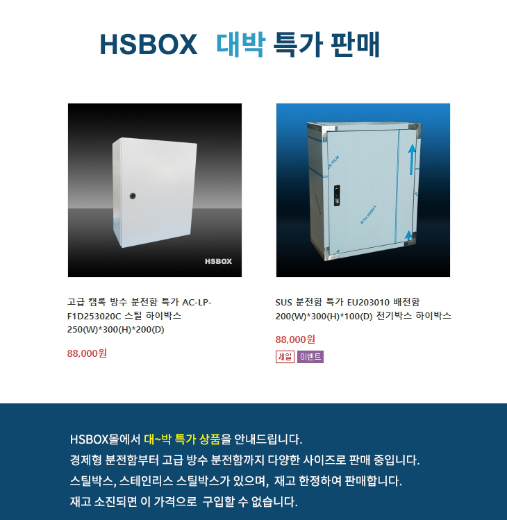 HSBOX몰에서 대~박 특가 상품을 안내드립니다. 경제형 분전함부터 고급 방수 분전함까지 다양한 사이즈로 판매 중입니다. 스틸박스, 스테인리스 스틸박스가 있으며, 재고 한정하여 판매합니다. 재고 소진되면 이 가격으로 구입할 수 없습니다. 특가 제품은 대부분 새 제품이며, 제품에 대한 특이사항이 있는 ..