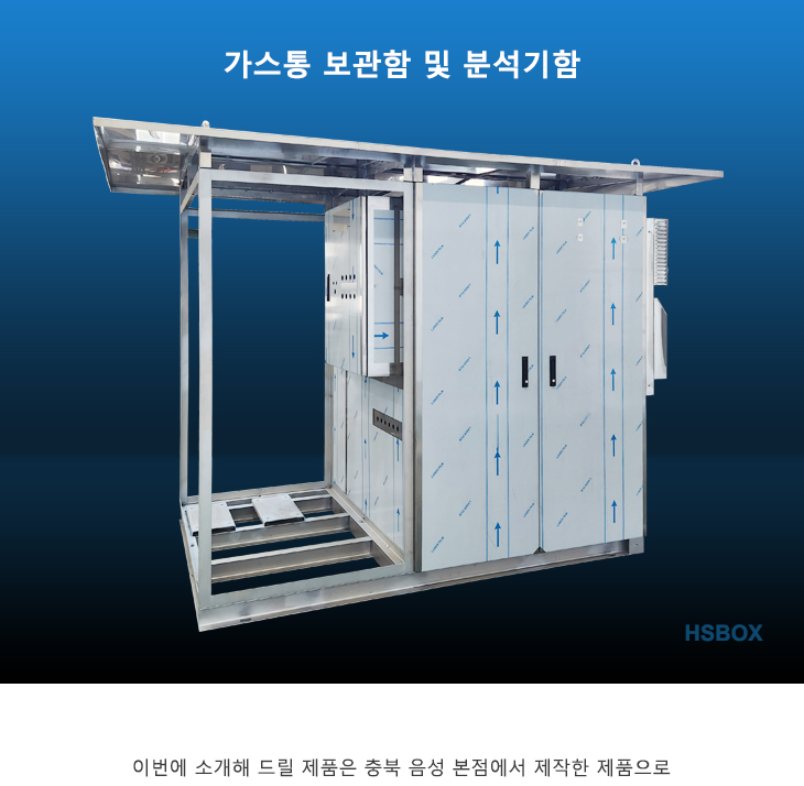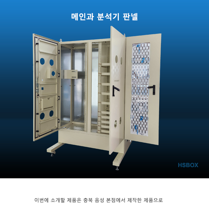 이번에 소개해 드릴 제품은 충북 음성 본점에서 제작한 제품으로 가스통 보관함과 분석기 판넬이 함께 있는 전기외함입니다. 분석을 할 때 많은 양의 열이 발산되는데, 우측에 설치된 에어컨이 빠르게 열을 낮출 수 있습니다.