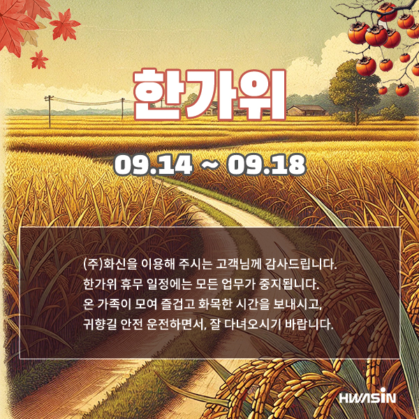 (주)화신을 이용해 주시는 고객님께 감사드립니다.한가위 휴무 일정에는 모든 업무가 중지됩니다.온 가족이 모여 즐겁고 화목한 시간을 보내시고,귀향길 안전 운전하면서, 잘 다녀오시기 바랍니다.