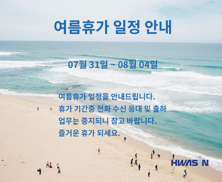 07월 31일 ~ 08월 04일 여름휴가 일정을 안내드립니다. 휴가 기간중 전화 수신 응대 및 출하업무는 중지되니 참고 바랍니다. 즐거운 휴가 되세요.