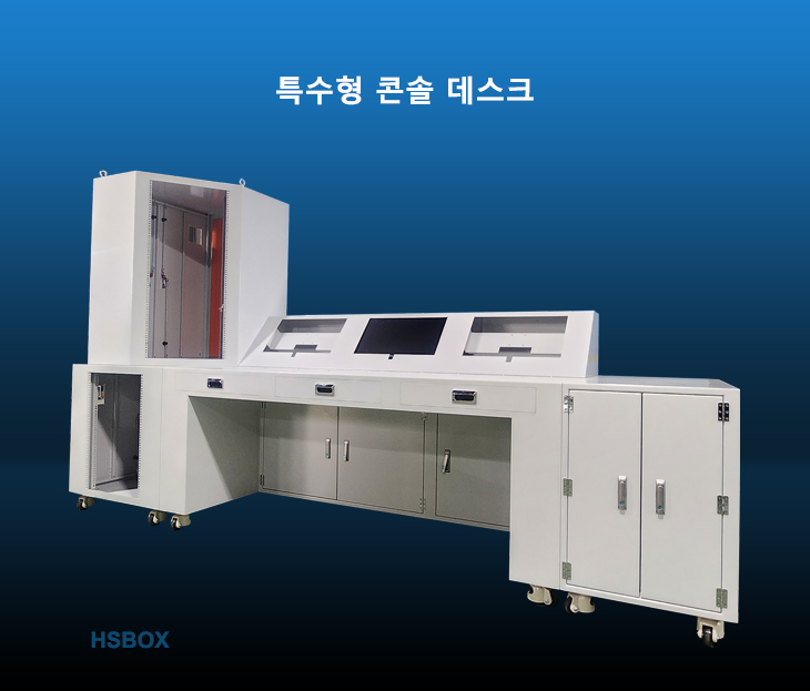 이번에 소개해 드릴 제품은 경기 시흥 지점에서 제작한 제품으로 여러 함체를 열반한 특수 목적용 대형 콘솔 데스크입니다. 열반 브라켓을 제거하면 여러 개의 판넬이 분리된 상태로 옮길 수 있고 이동 편의성을 더하고자 캐스터를 적용했습니다.