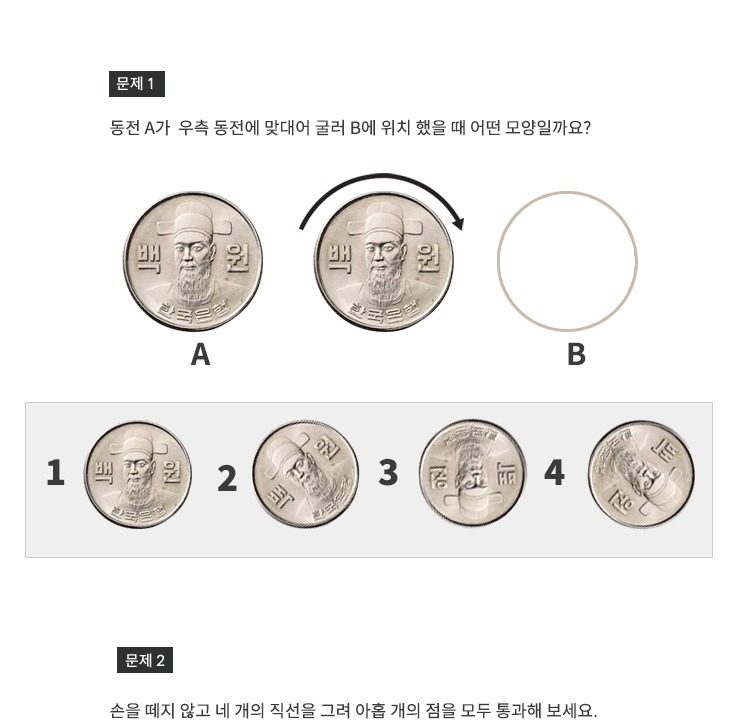 동전 A가 우측 동전에 맞대어 굴러 B에 위치 했을 때 어떤 모양일까요?