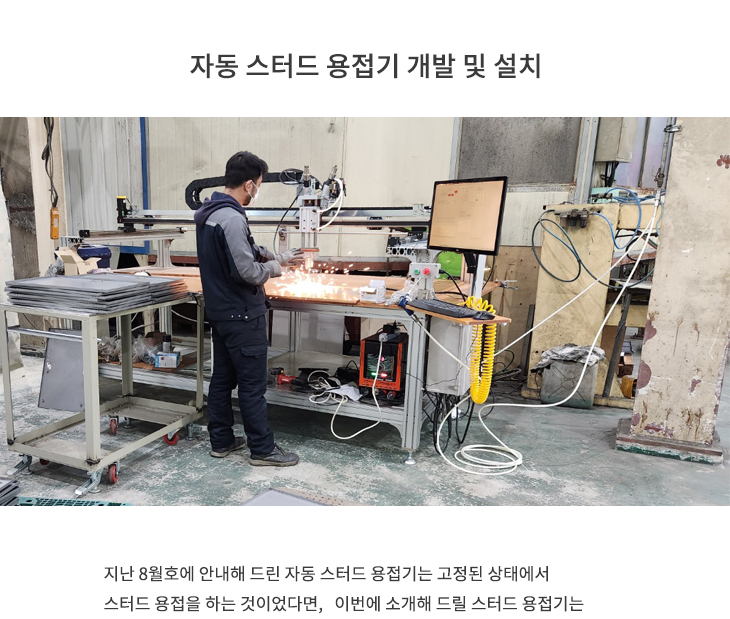 지난 8월호에 안내해 드린 자동 스터드 용접기는 고정된 상태에서 스터드 용접을 하는 것이었다면, 이번에 소개해 드릴 스터드 용접기는 CNC 처럼 X, Y 좌표를 인식하여 지정한 위치로 이동해 자동으로 스터드 용접을 하는 것입니다. 자동 스터드 용접기의 장점은 정확한 위치로 이동하여 수직으로 스터드 건이 ..