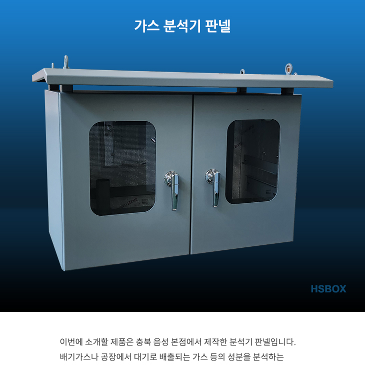 이번에 소개할 제품은 충북 음성 본점에서 제작한 분석기 판넬입니다. 배기가스나 공장에서 대기로 배출되는 가스 등의 성분을 분석하는 장비를 설치하는 전기외함입니다. 온도, 습도의 변화에 따른 분석의 편차 발생을 최소화하기 위해 판넬 내부에 단열재를 부착하고, 지붕을 얹었습니다.