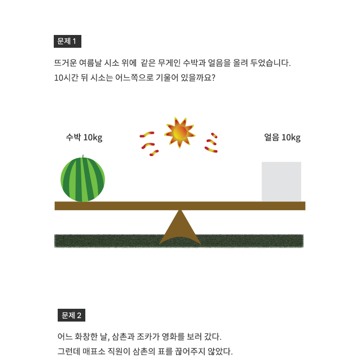 뜨거운 여름날 시소 위에 같은 무게인 수박과 얼음을 올려 두었습니다. 10시간 뒤 시소는 어느쪽으로 기울어 있을까요? 어느 화창한 날, 삼촌과 조카가 영화를 보러 갔다. 그런데 매표소 직원이 삼촌의 표를 끊어주지 않았다. 그러자 삼촌은 조카에게 돈을 내라고 했다. 그리고 조카 혼자 영화를 보고 나왔다. ..