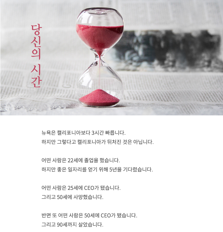 뉴욕은 캘리포니아보다 3시간 빠릅니다. 하지만 그렇다고 캘리포니아가 뒤처진 것은 아닙니다. 어떤 사람은 22세에 졸업을 했습니다. 하지만 좋은 일자리를 얻기 위해 5년을 기다렸습니다. 어떤 사람은 25세에 CEO가 됐습니다.