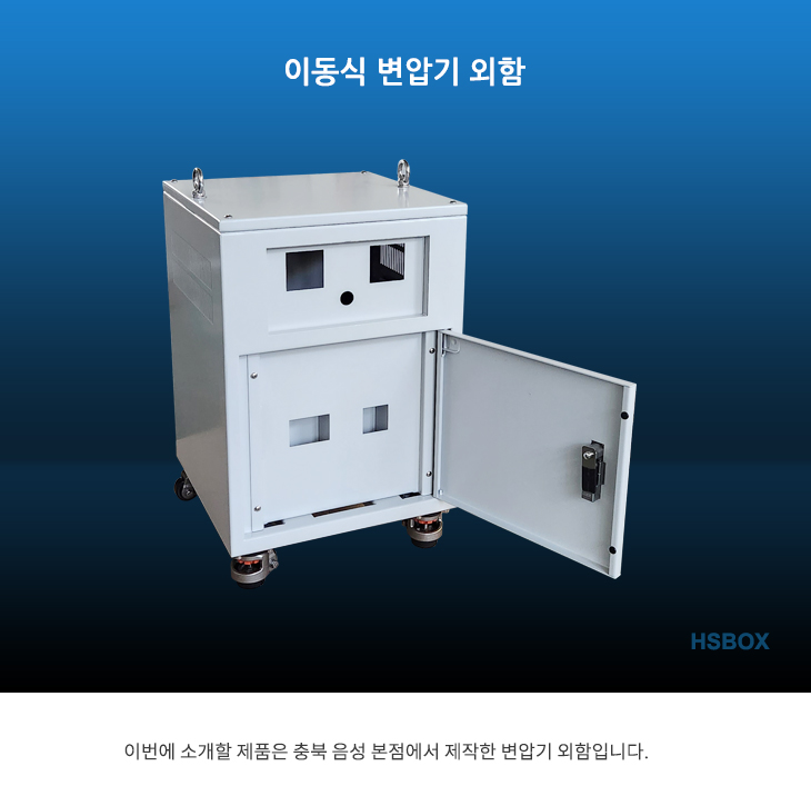 이번에 소개할 제품은 충북 음성 본점에서 제작한 변압기 외함입니다. 전·후면에 도어 방식으로 설계되어, 트랜스 설치에 용이하고, 양측면에 열 배출구를 만들어 내부 발생되는 열을 효과적으로 배출할 수 있습니다. 크레인을 이용해 옮길 수 있도록 인양 고리를 설치하고, 지면 이동 및 고정을 위해 캐..