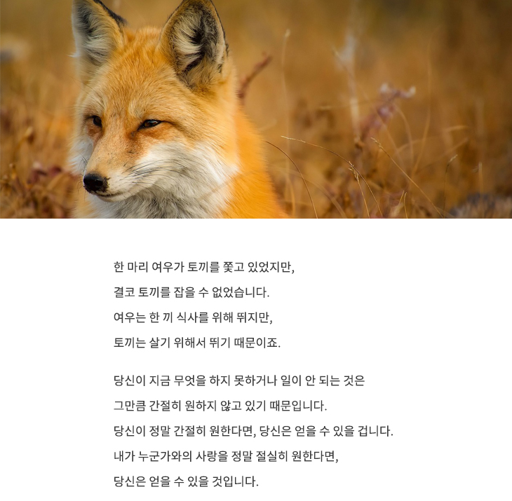 한 마리 여우가 토끼를 쫓고 있었지만, 결코 토끼를 잡을 수 없었습니다. 여우는 한 끼 식사를 위해 뛰지만, 토끼는 살기 위해서 뛰기 때문이죠. 당신이 지금 무엇을 하지 못하거나 일이 안 되는 것은 그만큼 간절히 원하지 않고 있기 때문입니다.