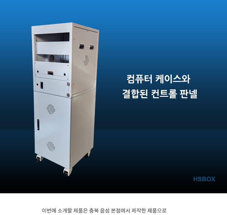 이번에 소개할 제품은 충북 음성 본점에서 제작한 제품으로 컴퓨터 케이스와 컨트롤 판넬이 결합된 제품입니다. 판넬 하부에 캐스터를 적용하여 이동 및 고정을 편리하게 이용할 수 있습니다. 상부 컴퓨터 케이스는 전면에 모니터를 설치하고, 키보드 서랍은 슬라이딩 방식과 손잡이를 채용해 이용 편의성에 ..