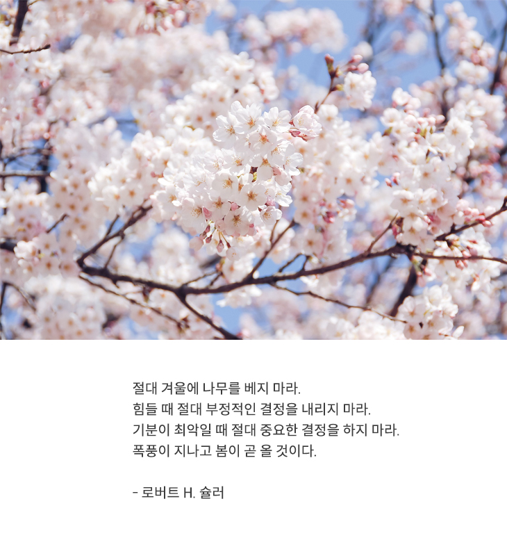 절대 겨울에 나무를 베지 마라. 힘들 때 절대 부정적인 결정을 내리지 마라. 기분이 최악일 때 절대 중요한 결정을 하지 마라. 폭풍이 지나고 봄이 곧 올 것이다. - 로버트 H. 슐러