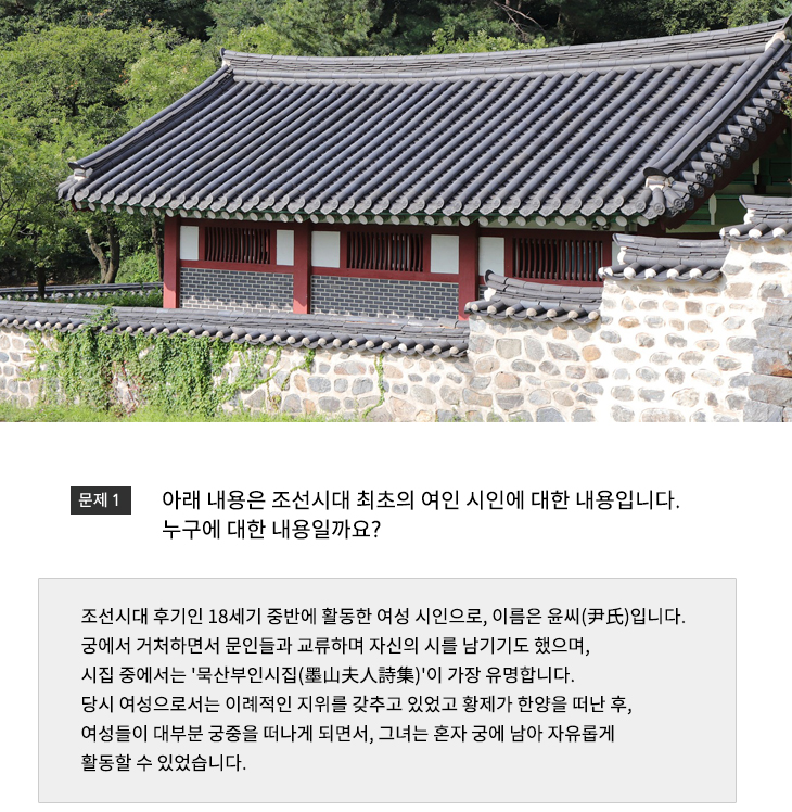 아래 내용은 조선시대 최초의 여인 시인에 대한 내용입니다. 누구에 대한 내용일까요? 조선시대 후기인 18세기 중반에 활동한 여성 시인으로, 이름은 윤씨(尹氏)입니다. 궁에서 거처하면서 문인들과 교류하며 자신의 시를 남기기도 했으며, 시집 중에서는 '묵산부인시집(墨山夫人詩集)'이 가장 유명합니다. 당..